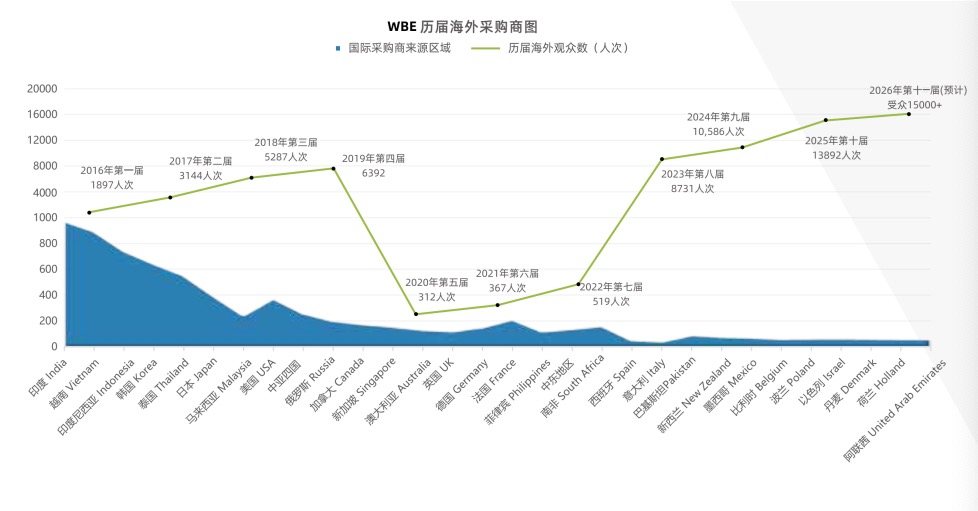 WBE2025展会现场,共接待了来自印度、越南、印尼、韩国、日本、马来西亚、哥伦比亚、新加坡、美国、加拿大、澳大利亚、英国、罗马尼亚、南非、泰国、巴基斯坦、德国、法国、西班牙、孟加拉、瑞典、荷兰、波兰、菲律宾、土耳其、墨西哥、巴西、中东地区、中亚四国、俄罗斯等100多个国家和地区的优质海外采购商13892人次,东南亚以及“一带一路”沿线国家成为本次展会外商来源的主要区域。