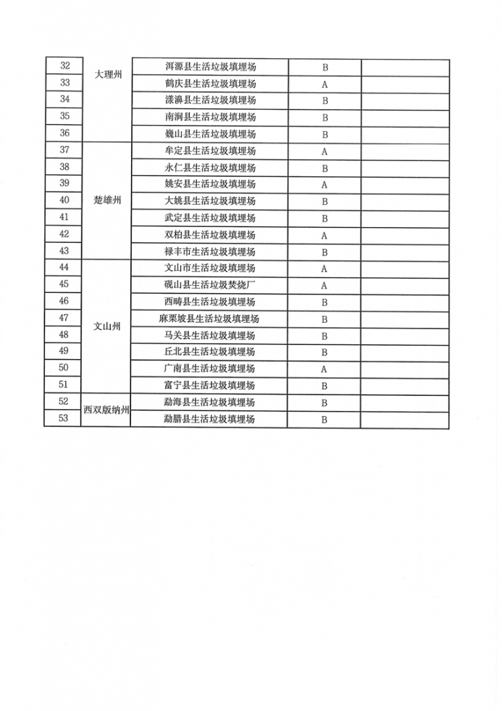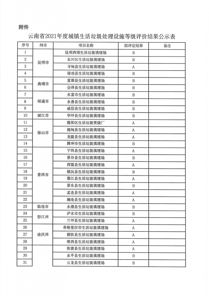 涉53座生活垃圾填埋场!云南省城镇无害化等级评定结果公示 作者: 边走边看 来源: 北极星环卫网 发布: 2022年4月9日 734阅读 0评论 原标题:涉53座生活垃圾填埋场!2021年度云南省城镇生活垃圾处理设施无害化等级评定结果公示 日前,云南住建厅分多批次组织省级专家对昆明西郊生活垃圾填埋场等66座生活垃圾填埋场(焚烧厂)开展了省级现场评定,其中通过省级现场评定的合计53座。现将2021年度云南省城镇生活垃圾处理设施无害化等级评定结果公示如下: 北极星环卫网