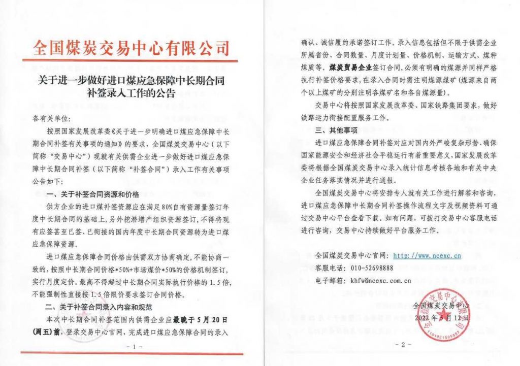 全国煤炭交易中心:不得将现有应签甚至已签、已衔接的国内年度中长期合同资源转为进口煤应急保障资源 作者: 边走边看 来源: 同花顺7x24快讯 发布: 2022年5月12日 649阅读 0评论 全国煤炭交易中心发布关于进一步做好进口煤应急保障中长期合同补签录入工作的公告,公告提到,供方企业的进口煤补签资源应在满足80%自有资源量签订年度中长期合同的基础上,另外挖潜增产组织资源签订,不得将现有应签甚至已签、已衔接的国内年度中长期合同资源转为进口煤应急保障资源。 同花顺7x24快讯