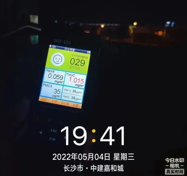 △ 上图说明:居民自购了检测设备,测量结果也证实了他们的担心。根据国家相关标准,室内tvoc(总挥发性有机化合物)值等于或小于0.60mg/m3才算安全,而有居民自行检测的该值为1.015mg/m3。