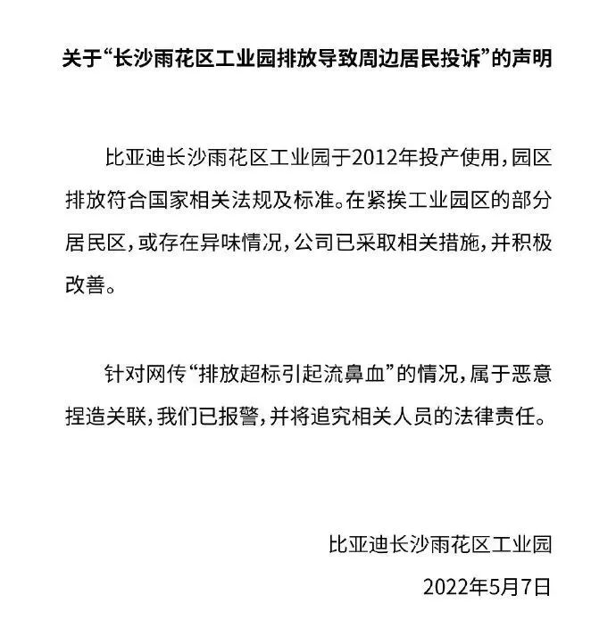 从比亚迪《关于“长沙雨花区工业园排放导致周边居民投诉”的声明》中可以看到明显的推卸责任的意愿和强势的威慑。