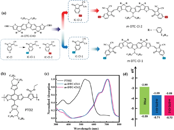 李永舫院士课题组合成了两个具有不同氯取代位置的中等带隙 (1.63 eV) 异构小分子受体 m-DTC-Cl-1 和 m-DTC-Cl-2。IC基团中不同的氯取代位置对受体的物理化学性质、电荷动力学、形态和光伏性能有显着影响。因此,以 PTO2 作为聚合物给体和 m-DTC-Cl-2 作为受体的 OSC 具有 14.1% 的冠军功率转换效率 (PCE),具有 1.05 V 的高开路电压和 0.25 eV 的低非辐射能量损失,这表明该OSC是作为 TOSC 前端单元应用的理想候选者。然后,作者以基于 PTO2:m-DTC-Cl-2 的 OSC 为前电池和基于 PTB7-Th:BTPV-4Cl 的 OSC 作为后电池制造了单片 TOSC,其 PCE 高达 18.8%。