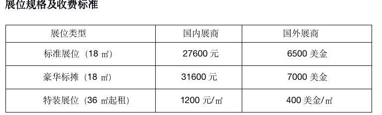 特装展位:特装展位不含任何展具,展商自行设计搭建展位。(注:特装展位届时由主场搭建商收取管理费,收费标准:35元/m²)