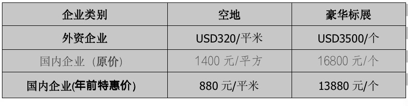 | 外资企业 | USD320/平米 | USD3500/个 |