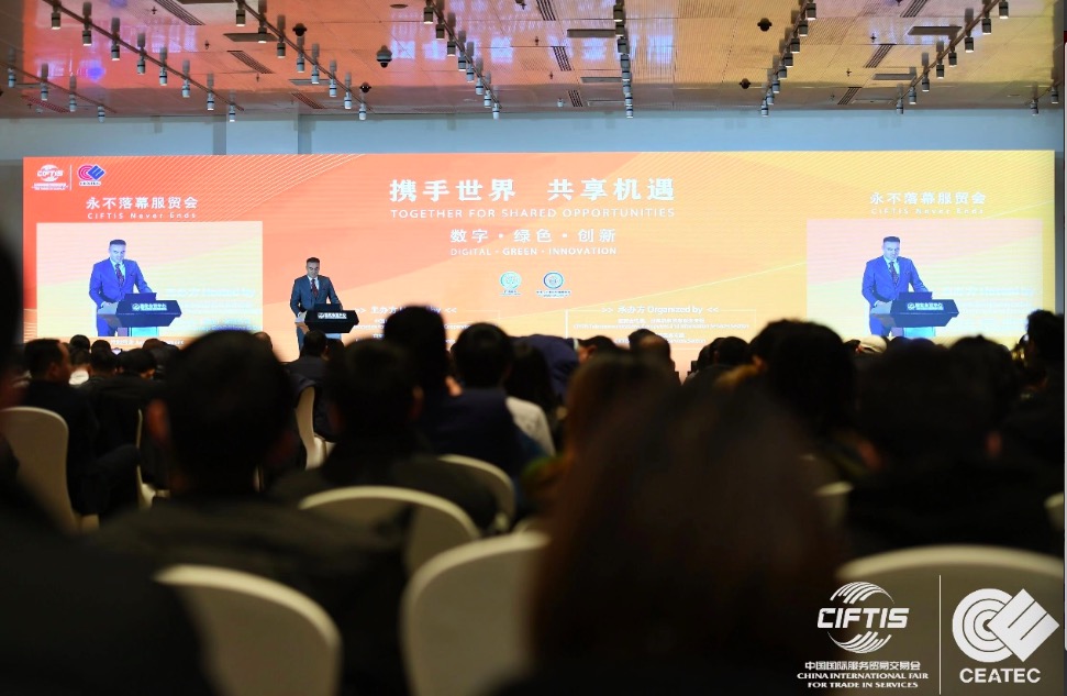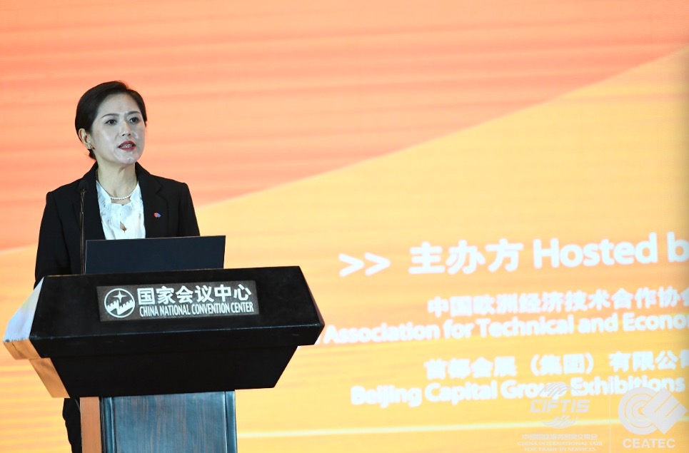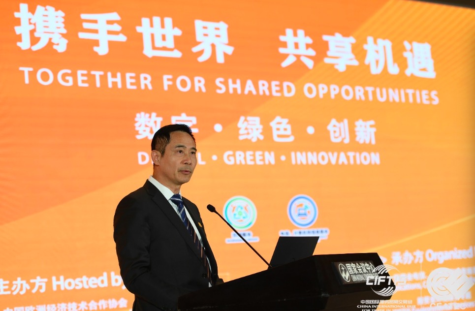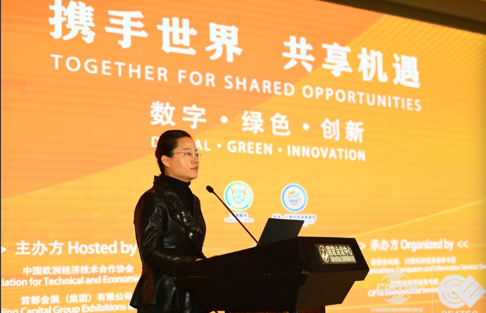 中国欧洲经济技术合作协会常务副会长兼秘书长陈璟玥、首都会展(集团)有限公司总经理周一炜代表活动主办方致辞,介绍服贸会电信计算机和信息服务专题与环境服务专题探索板块融合、联动的新路径,共同打造“数字绿色服贸”。
