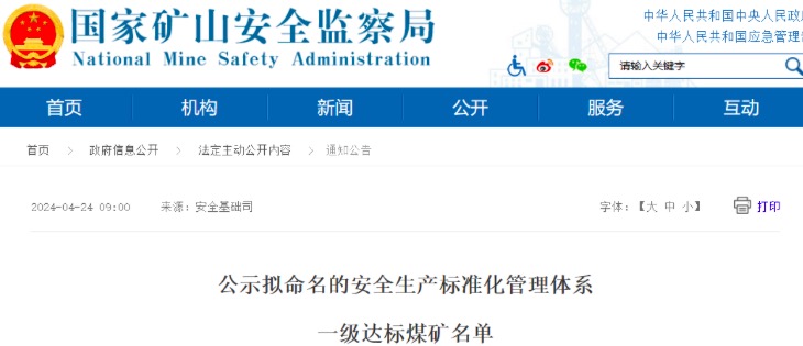 4月24日,国家矿山安全监察局发布《公示拟命名的安全生产标准化管理体系一级达标煤矿名单》。