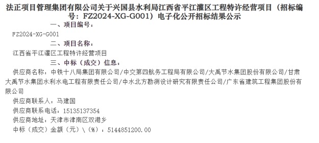 5月23日,中国水网从E20环境平台标讯采集系统E标通获悉,江西省平江灌区工程特许经营项目中标结果公示,中标金额5144851200.00元,中标人:中铁十八局集团有限公司、中交第四航务工程局有限公司、大禹节水集团股份有限公司、甘肃大禹节水集团水利水电工程有限责任公司、中水北方勘测设计研究有限责任公司、广东省建筑工程集团股份有限公司联合体,招标人兴国县水利局。