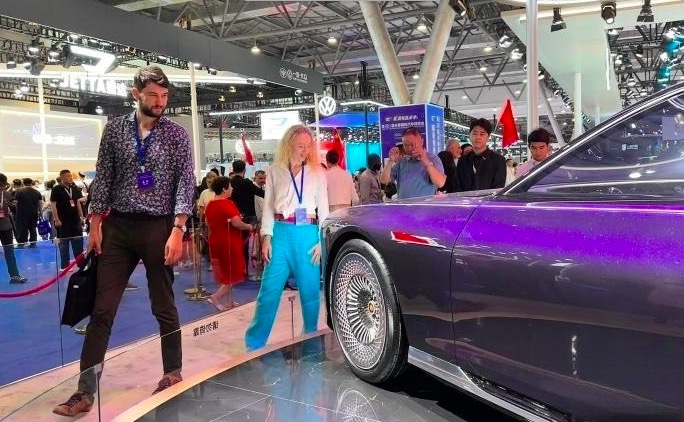 7月16日,外商在第21届长春国际汽车博览会上参观中国红旗汽车。