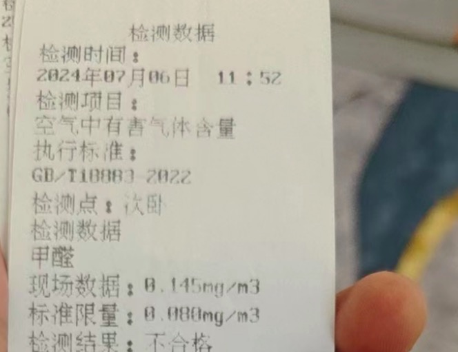 杜兰回忆,2023年春节前,她通过某短视频平台浏览到森家环保官方账号的带货直播,便在网上下了订单。2024年1月13日,森家环保把订单指派给成都加盟商陈强,他对杜兰家的主卧、次卧、儿童房进行了甲醛检测,3个房间的检测结果显示,主卧的甲醛浓度为每立方米0.17毫克,次卧为每立方米0.139毫克,儿童房为每立方米0.114毫克。