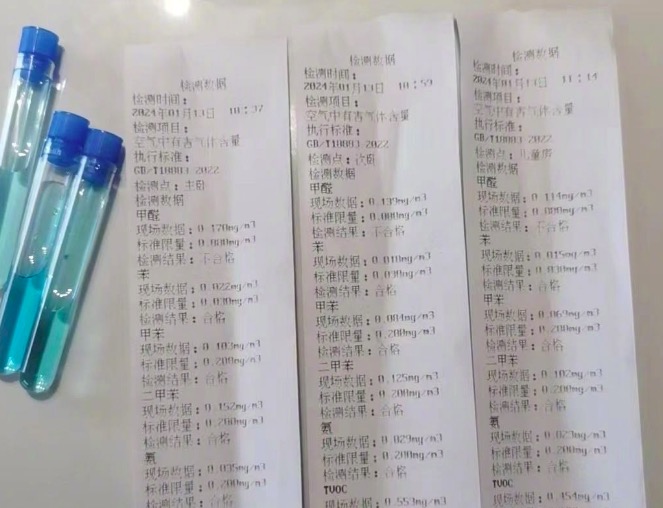 杜兰回忆,由于甲醛超标,工作人员便对全屋进行甲醛治理。今年2月18日,按照服务约定,陈强对她家进行了复检,检测数据显示,客厅、主卧、次卧的甲醛浓度分别为每立方米0.03毫克、每立方米0.042毫克、每立方米0.051毫克,检测结果均为“合格”。至此,她才安心在新房居住。